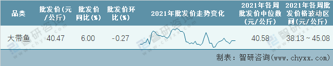 根据农村农业部数据统计可知:2021年第53周全国大带鱼平均批发价为40.47元/公斤,同比增加6%,环比下跌0.27%(第52周数据未公布,按第51周的数据统计),2021年大带鱼价格总体出现了多个峰值,价格最高峰出现在年中,2021年全国大带鱼平均批发价最高达到45.08元/公斤,批发价最低也要38.13元/公斤。